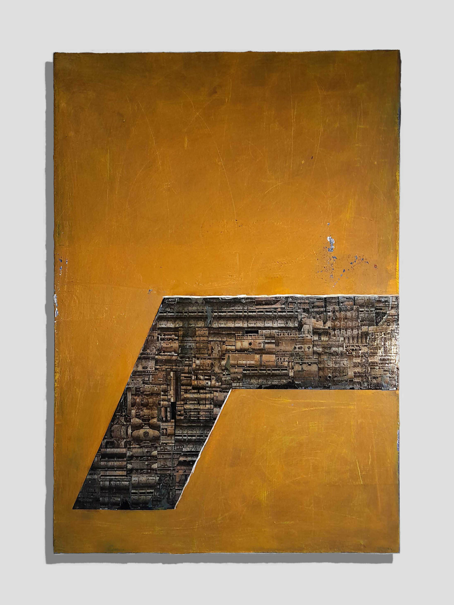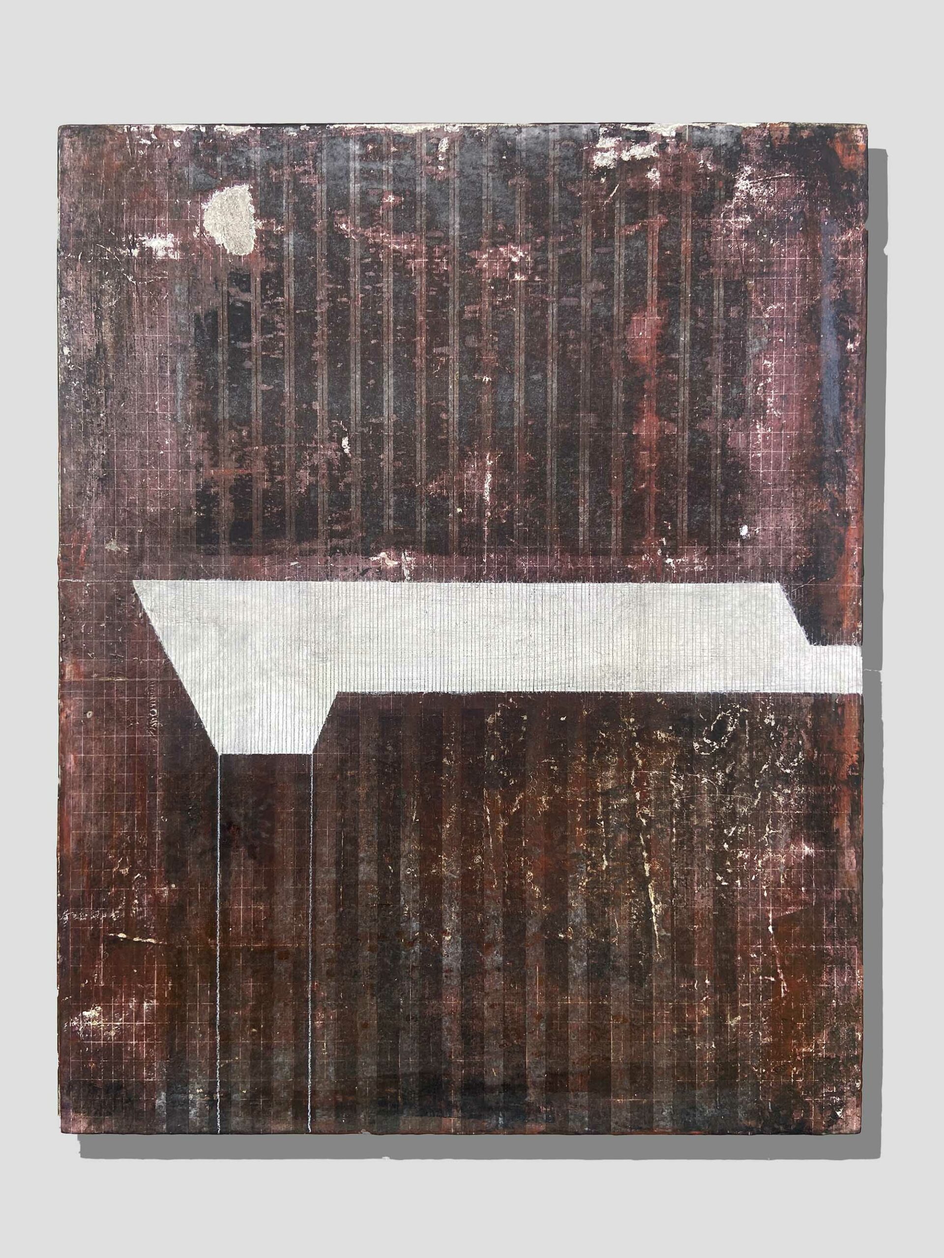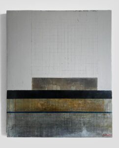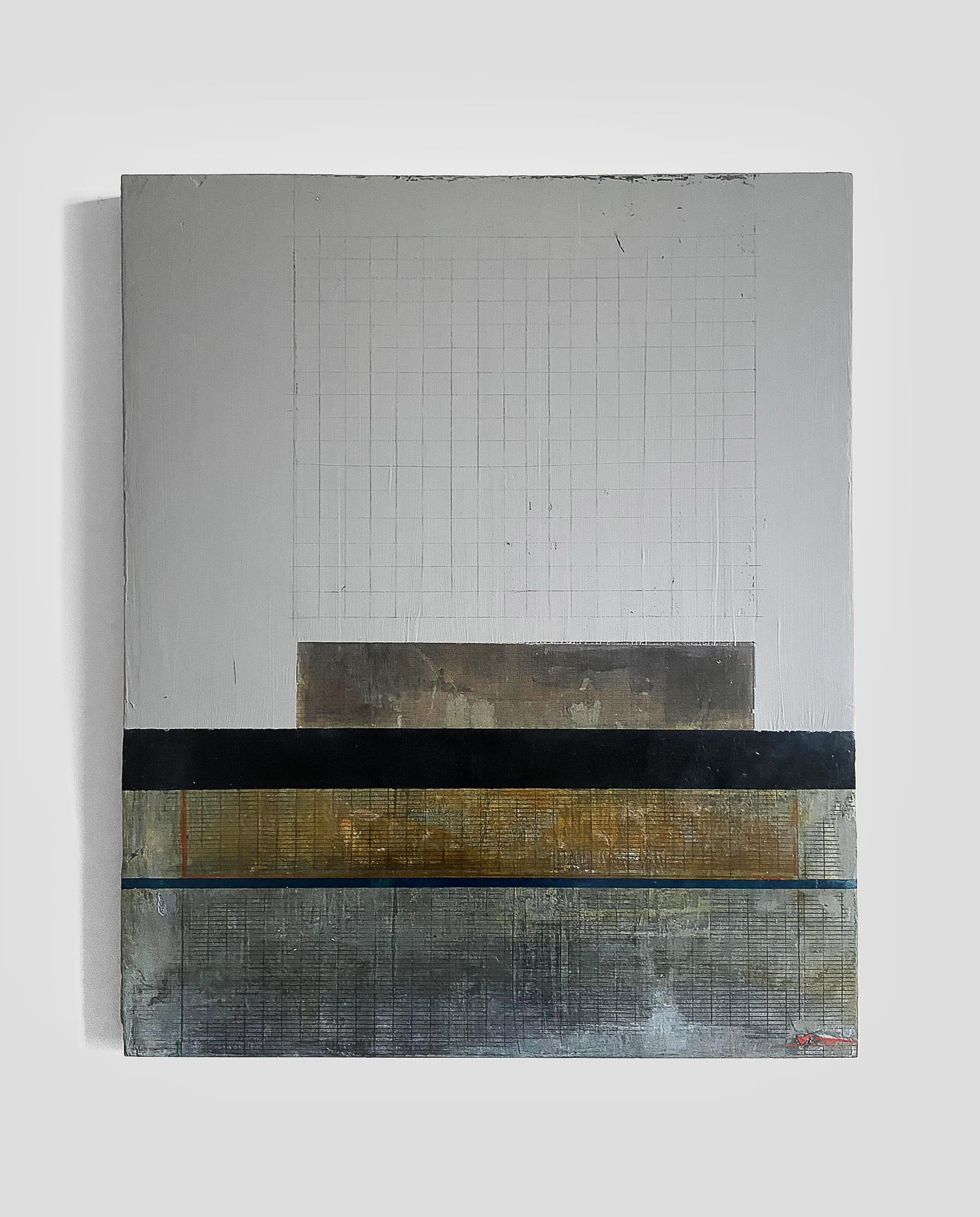 These abstract artworks explore themes of territories and wasteland through acrylic painting on wooden panel and pigment print on raw linen. Geometric divisions, earthy tones, and softly textured surfaces evoke arid expanses and rigid structural rhythms. Layered forms and tonal erosion hint at processes of decay and emergence, tracing the tension between natural stillness, imposed order, and shifting spatial grids.